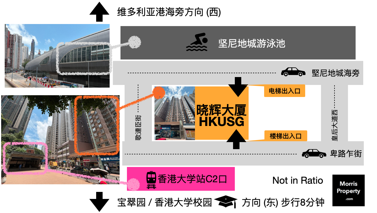 曉輝大廈(HKUSG)樓下 香港大學地鐵站C2出口 經西寶城購物中心 步行直達香港大學校園(8分钟) (香港大學租房)
